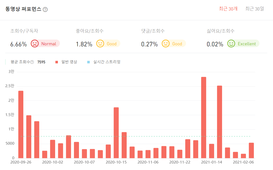 또한 [동영상 분석] 탭으로 가면 최근에 올린 동영상에 대한 분석 결과를 알려준다. 조회수 대비 좋아요가 많이 눌리고, 싫어요는 적게 눌릴수록 높은 점수를 부여하는 것 같다.