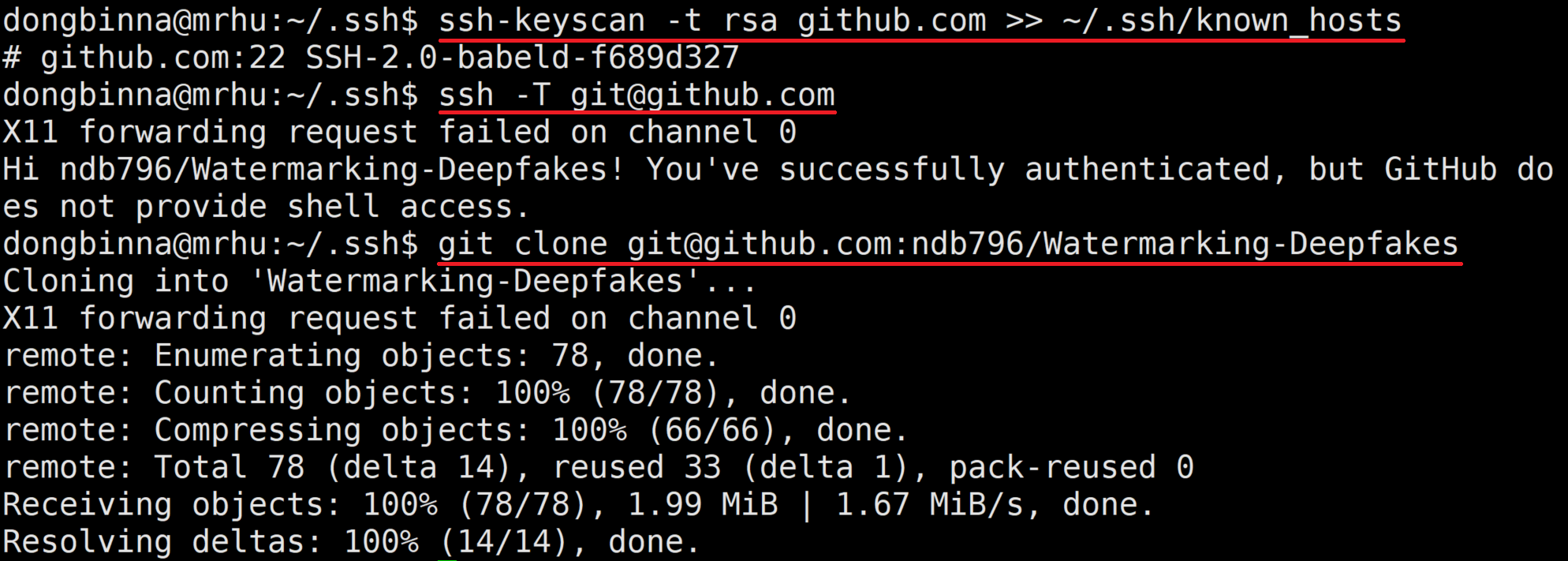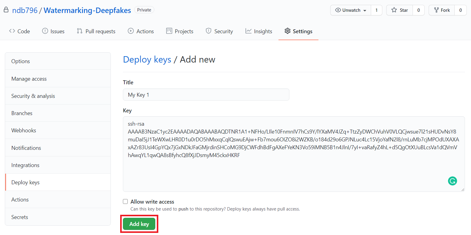 필자의 경우 private repository인 Watermarking-Deepfakes라는 이름의 저장소에 있는 코드를 받아왔다.