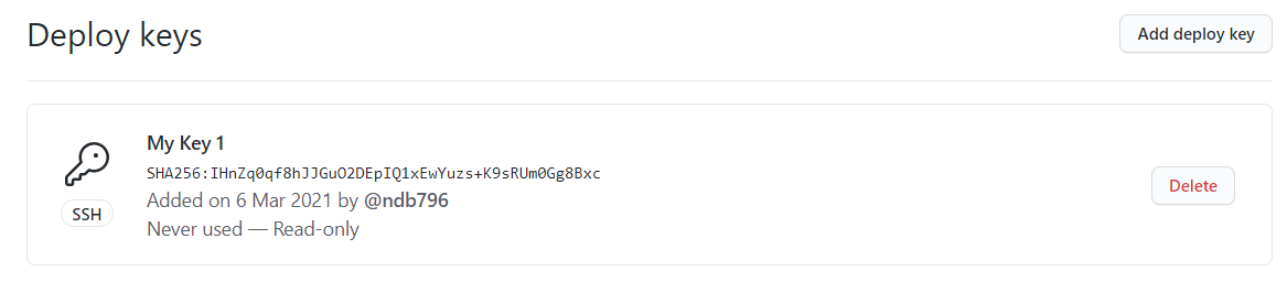 결과적으로 이러한 공개키(public key)의 내용을 그대로 특정한 저장소(repository)의 keys 설정 페이지에 넣어주면 된다. 다음과 같이 [Key] 탭에 붙여넣기 하여 [Add key] 버튼을 누르면 등록된다. 참고로 특정한 private repository의 keys 설정 페이지는 다음의 경로에서 확인할 수 있다.
