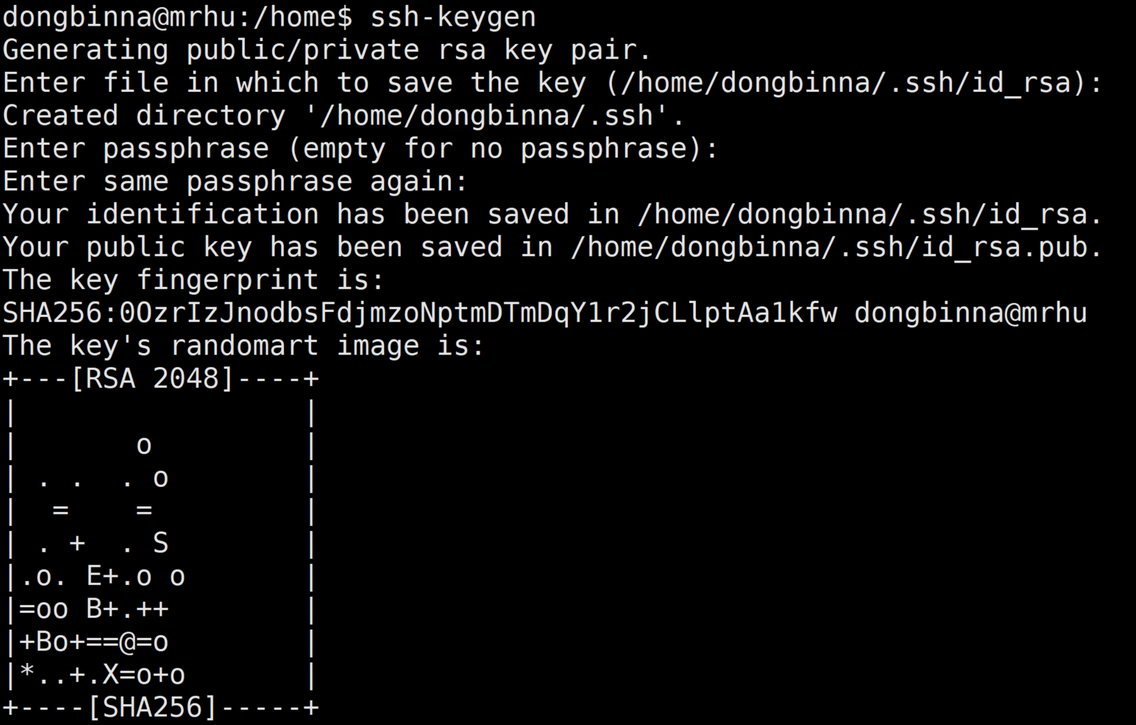 구체적인 과정은 ① SSH 개인키와 공개키를 생성한 뒤에, ② 내 GitHub에 SSH 공개키를 등록하는 것이다. 그러면 나중에 SSH 개인키를 이용해 내 GitHub에 접근할 수 있다. 리눅스에서 SSH 키를 생성하는 방법은 간단하다. ssh-keygen 명령어를 입력하면 된다.
