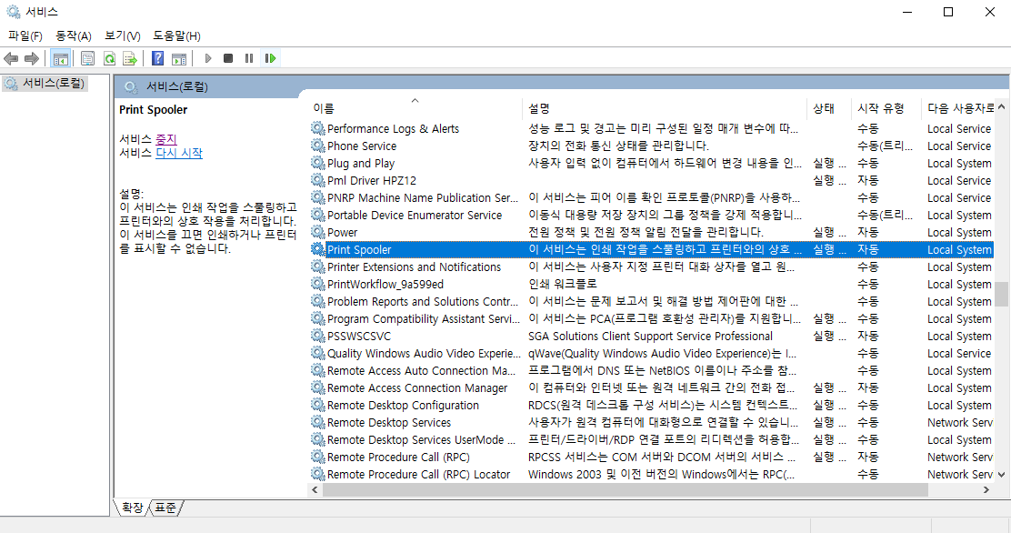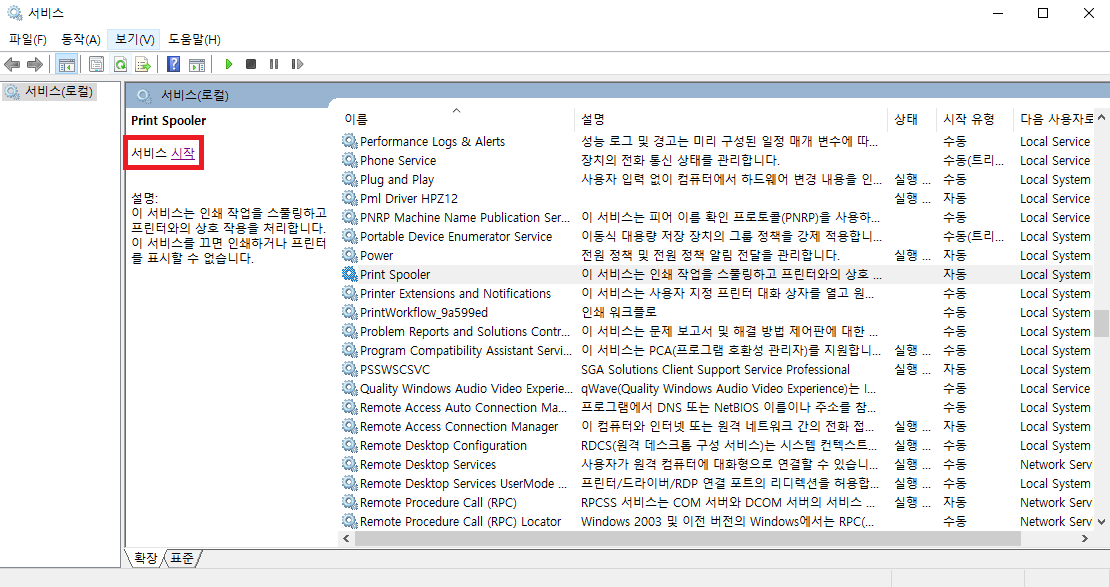 결과적으로 모든 .SPL 확장자를 제거한 뒤에 다시 Print Spooler 서비스(service)를 [시작]하면 된다.