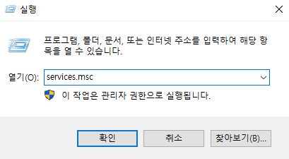 이런 문제를 해결하기 위해서 가장 먼저 컴퓨터와 프린터기를 재부팅해보자. 만약에 그렇게 해도 해결이 안 된다면 다음과 같이 해결해보자. 윈도우 키 + R을 눌러서 [실행] 창을 열어 다음과 같이 services.msc를 입력한다.