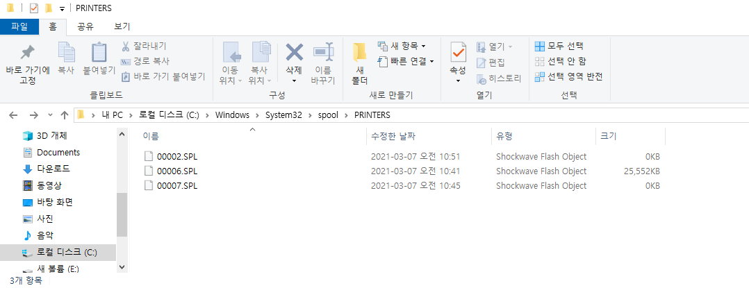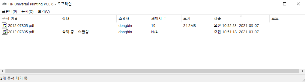 여기에서 스풀링(spooling) 파일을 확인할 수 있는데, 이 파일들을 모두 제거하면 강제로 작업을 취소할 수 있다. 또한 이 파일들도 제거가 안 될 수 있다. 구글 크롬이나 문서 PDF 프로그램이 열려 있는 경우에 그럴 수 있는데, 이 경우에는 컴퓨터를 재부팅 하는 것이 좋다.