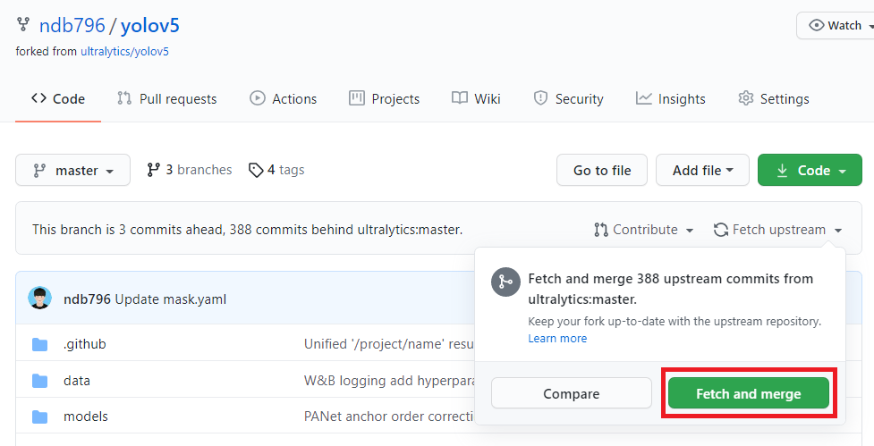 만약 Public 저장소를 포크(fork)했는데, 부모 저장소의 코드가 새롭게 갱신되는 경우 다음과 같은 메시지가 나올 수 있다. 이때는 [Fetch upstream]을 눌러 [Fetch and merge] 버튼을 눌러 최신 상태로 갱신할 수 있다.