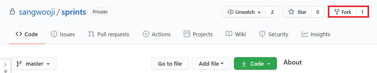 흔히 다른 사람의 저장소를 Fork하기 위해서는 [Fork] 버튼을 눌러 자신의 저장소로 옮긴다. (이때 부모 저장소가 private이라면, 당연히 자신이 Fork한 저장소 또한 private 저장소 형태로 복제가 완료된다.)