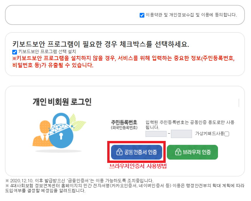 이후에 [공동인증서 인증]을 이용하여 간단히 로그인할 수 있다. 이때 공인인증서가 필요하다.