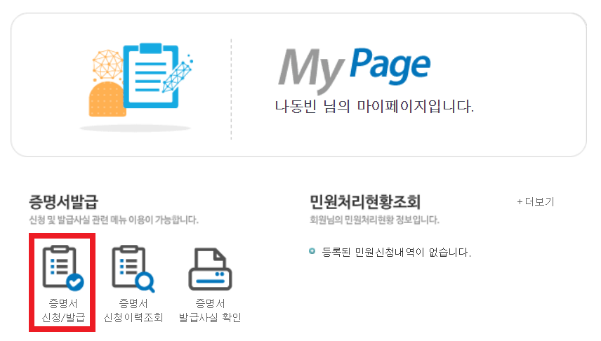 이후에 다음과 같이 [증명서 신청/발급] 버튼을 누른다.