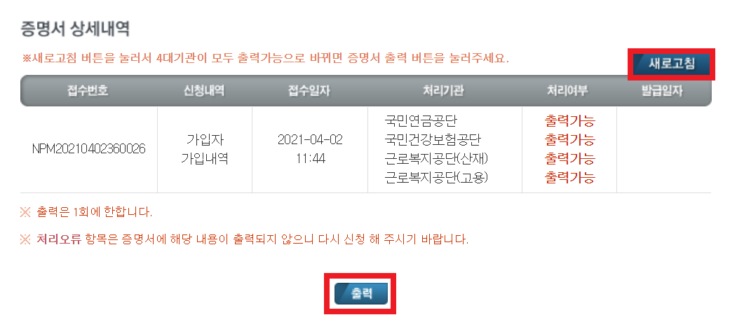 이제 각 기관에서 발급 요청을 처리하기까지 시간이 소요되는데, 10초 정도 기다린 뒤에 [새로고침] 버튼을 누르면 일반적으로 모든 처리가 끝나서 [출력]이 가능하다.