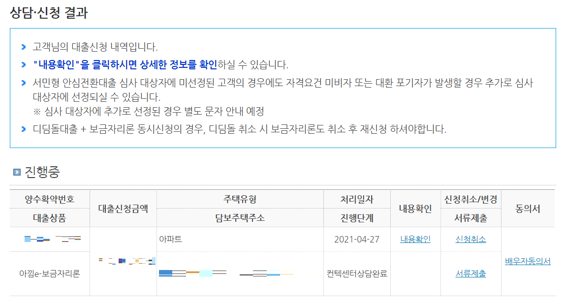 이어서 5월 10일에 한국주택금융공사 사이트에 다시 방문했는데, 다음과 같이 "지사심사중" 상태로 변경된 것을 확인할 수 있었다.