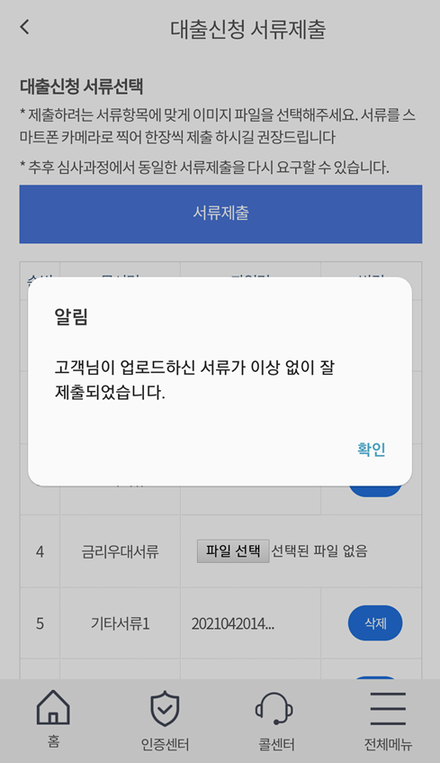 결과적으로 [서류제출] 버튼을 누르면 다음과 같이 메시지가 나온다.