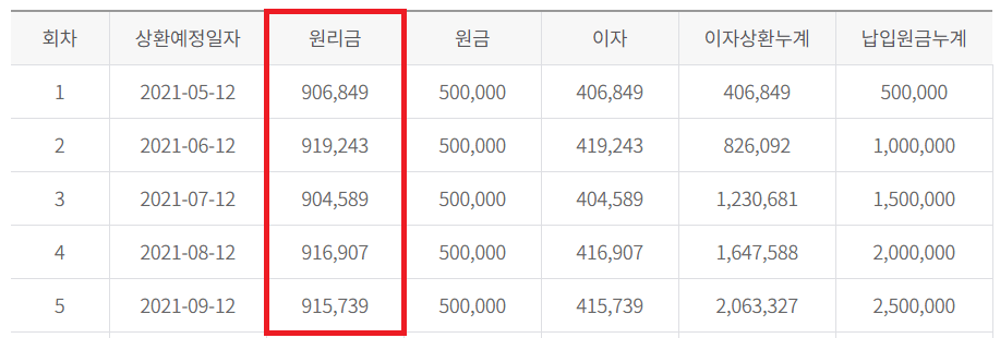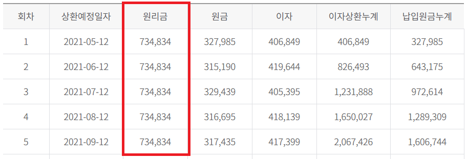 원리금균등분할상환의 경우 다음과 같이 나온다. 말 그대로 원리금이 처음부터 끝까지 그대로 가는 것이다.