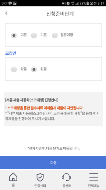 이후에 스크래핑 서비스를 이용하기 위해 동의하는 과정을 거치면 된다. 주민등록등본, 가족관계증명서와 같이 필수적인 서류를 자동으로 제출해주는 것이다. 내가 일일이 뽑아 제출하지 않아도 되기 때문에 편하다.
