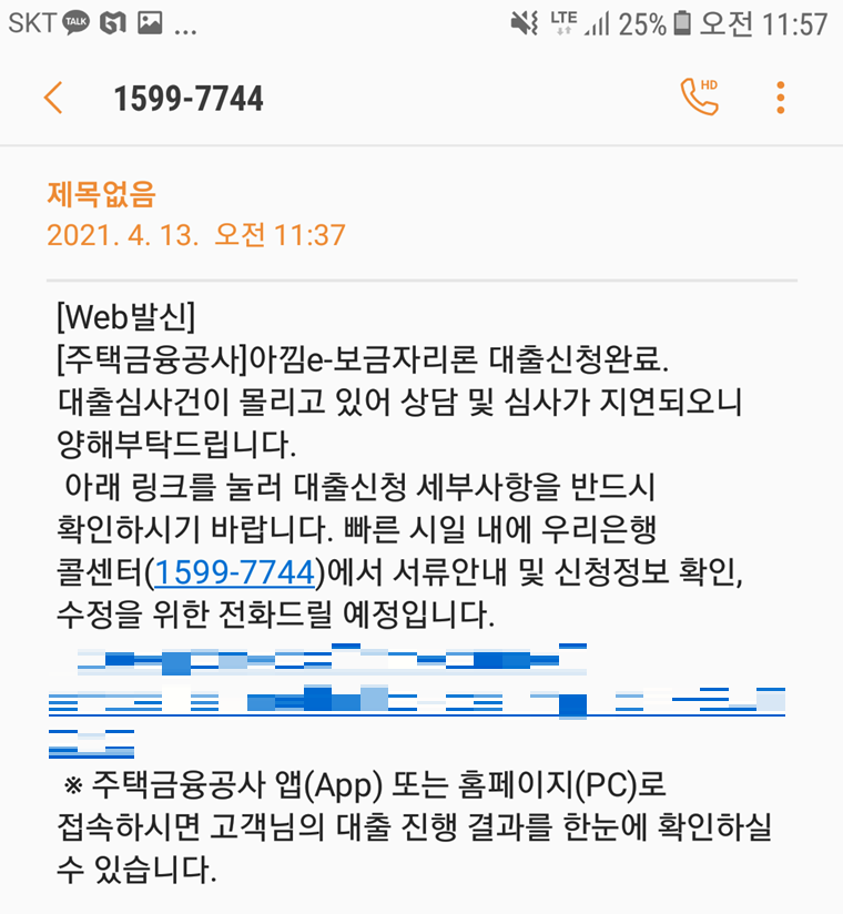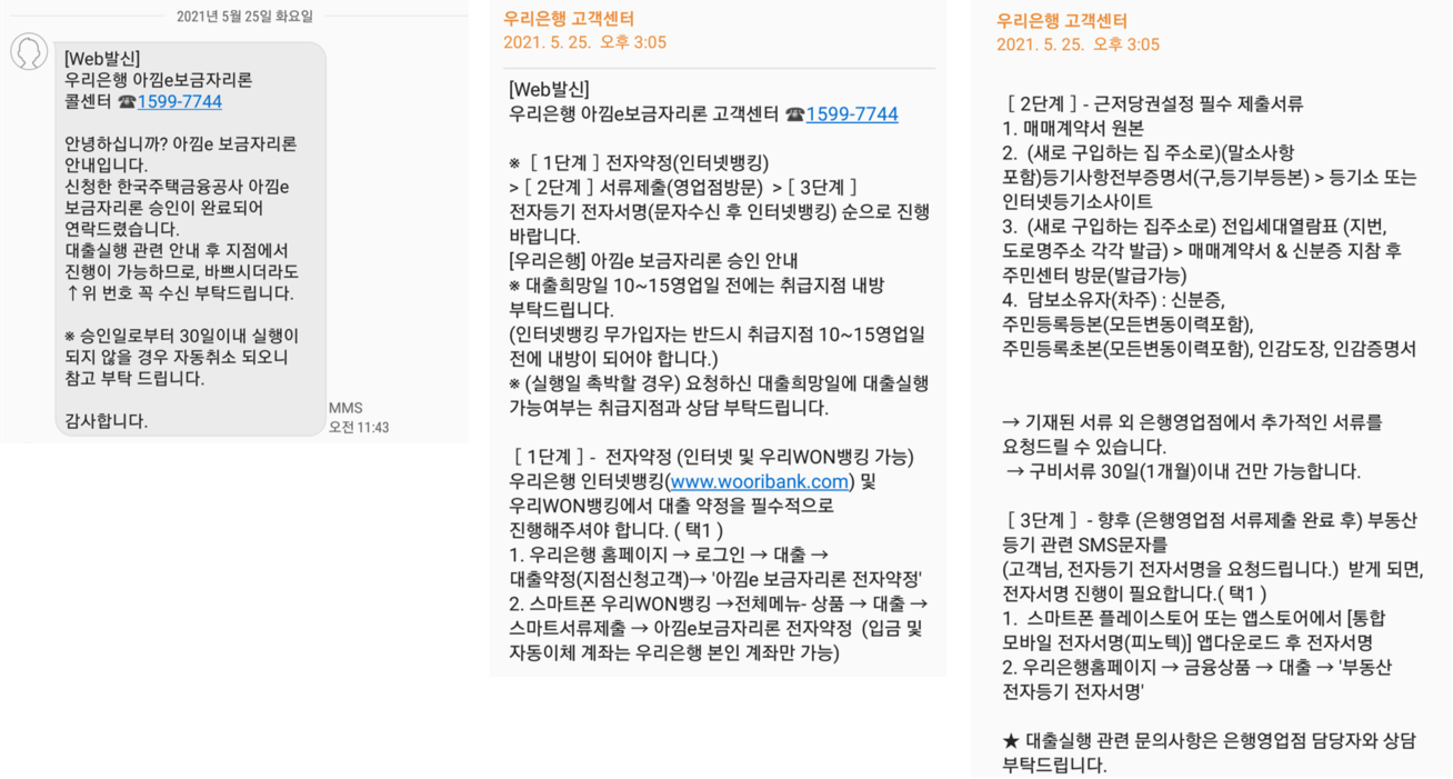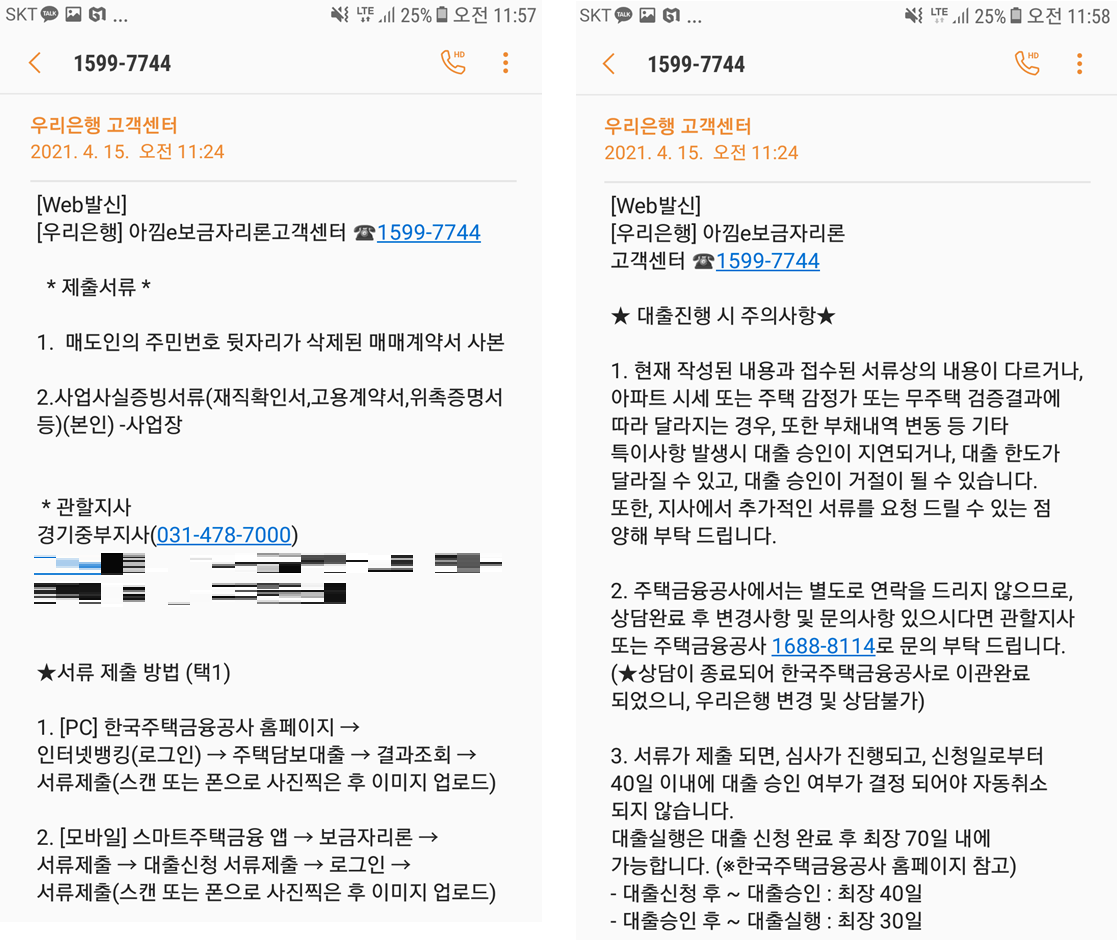 대출 신청이 완료되면, 콜센터에서 상담이 온다. (필자의 경우 대출 신청 이후 2일 뒤에 왔다.) 필자는 우리은행을 선택했기 때문에 우리은행 지점에서 연락이 왔다. 콜센터 상담을 할 때는 본인이 대출 신청할 때 작성했던 내용을 중심으로 확인 절차를 진행한다. 이때 대출 내용을 변경하는 것도 가능했다. 콜센터 상담이 완료되면 다음과 같은 문자 메시지를 받게 된다.