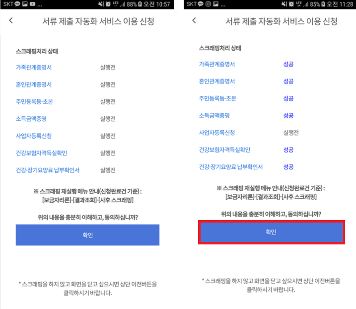 공동인증서(공인인증서) 서명 이후에 다음과 같이 스크래핑 서비스를 진행하면 된다. 모든 스크래핑이 다 처리된 이후에는 [확인] 버튼을 눌러 넘어가면 된다.