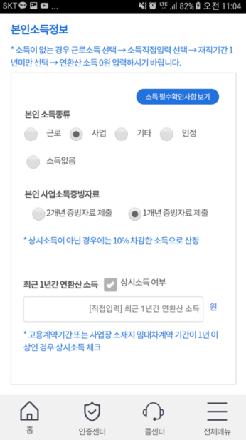필자의 경우 증빙 소득을 위한 2개년은 2018년과 2019년이다. 하지만 필자는 2018년에는 소득이 낮았고, 2019년에는 소득이 상대적으로 높았다. 그래서 대출을 신청할 때는 [1개년 증빙자료 제출] 버튼이 있길래 이걸 눌렀다. 하지만 콜센터 상담원은 왜 1개년만 제출했냐고 물으시며, 2018년에는 사업소득이 얼마였는지 물어보셨다.