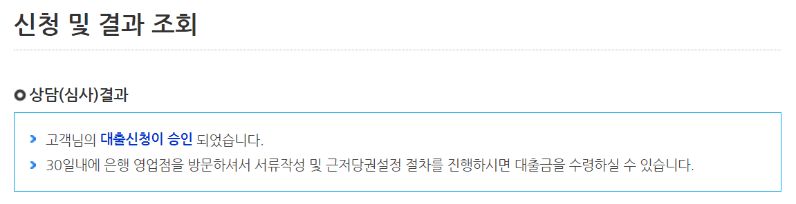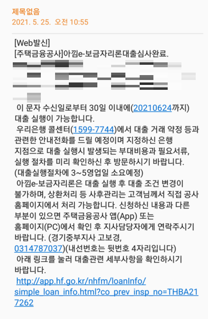 대출 승인이 완료되면, 나중에 은행에 방문하여 필요 서류를 제출해야 한다. 필자는 5월 25일에 대출 승인이 났다. 대출 승인이 되면 은행 영업점으로부터 전화가 오고, 필요한 서류를 제출하라는 내용을 전달받게 된다. 실제로 대출금은 내 통장에 바로 들어오는 것이 아니라, 법무사가 대출금을 가지고 처리를 해주는 것이 일반적이기 때문에 자세한 내용은 영업점과 상의하여 진행해야 한다.
