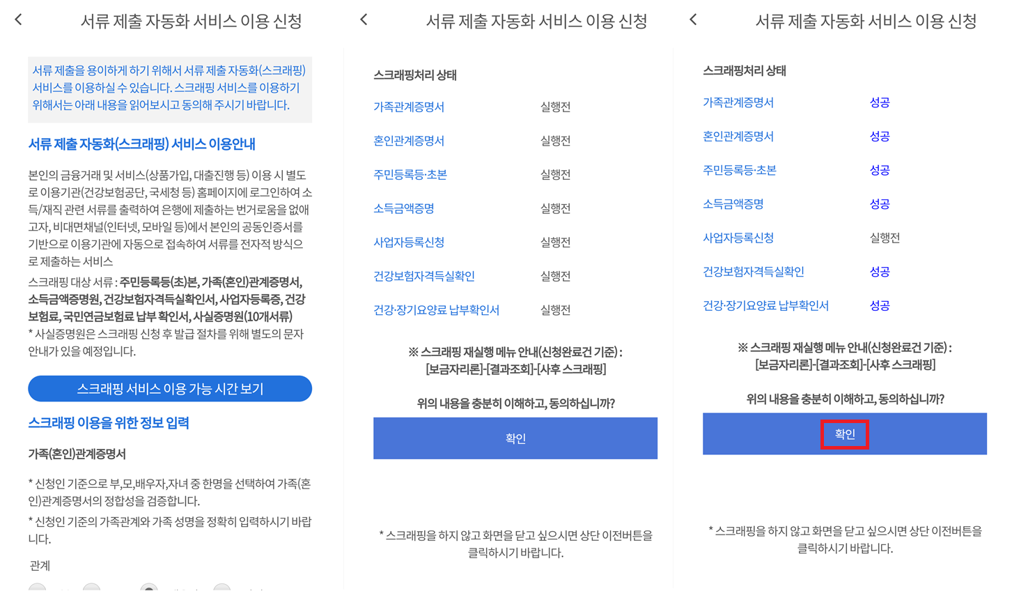이후에 사후 스크래핑을 진행한다. 마찬가지로 소득금액증명서, 건강보험자격득실확인서 등의 자료가 자동으로 스크래핑되어 제출되도록 하는 것이다.