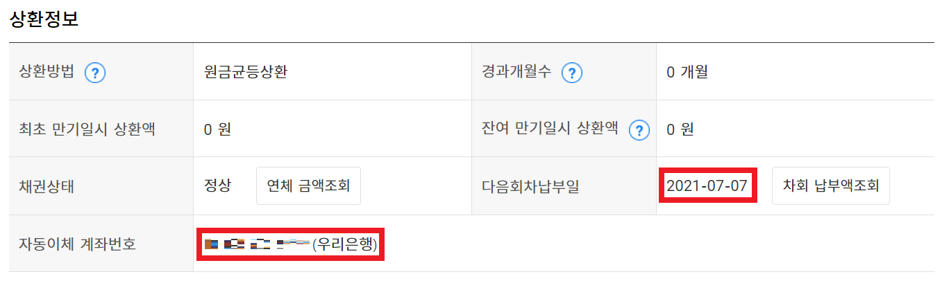 이어서 [상환정보] 페이지로 이동하면 다음과 같이 [다음회차납부일]과 [자동이체 계좌번호]를 확인할 수 있다. 해당 납부 일자가 되면, 자동이체 계좌번호에서 해당 금액만큼 빠져나가는 방식이다.