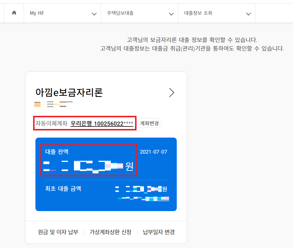 이후에 다음과 같이 현재 자신이 받은 보금자리론 대출 정보를 확인할 수 있다. 남은 갚아야 할 돈인 [대출 잔액]과 [자동이체계좌]를 확인하는 것이 중요하다.