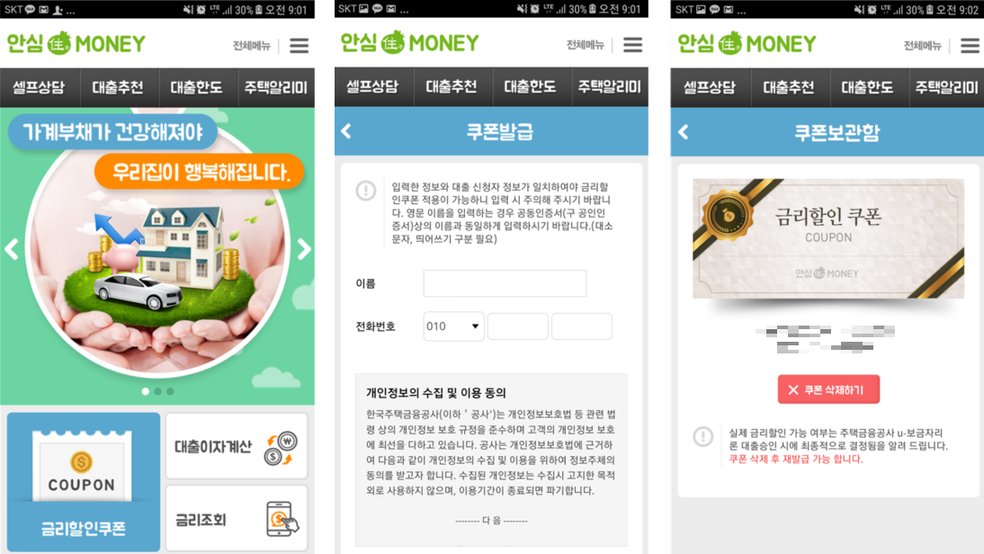 2. 안심주머니 앱 설치: 안심주머니 앱을 설치하면 금리할인쿠폰이 나온다. 꼭 설치해서 할인쿠폰을 받도록 하자. 금리 0.02%의 혜택은 절대 적은 금액이 아니다.