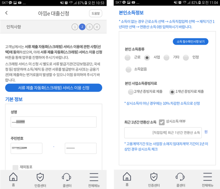 3. 대출 신청서 작성: 앱이나 홈페이지에 방문하여 대출 신청서를 작성할 수 있다. 참고로 프리랜서의 경우에는 근로소득이 없을 수 있어서, 소득금액증명원과 같은 서류를 통해 수익(사업소득)과 관련한 내용을 증빙할 필요가 있다.