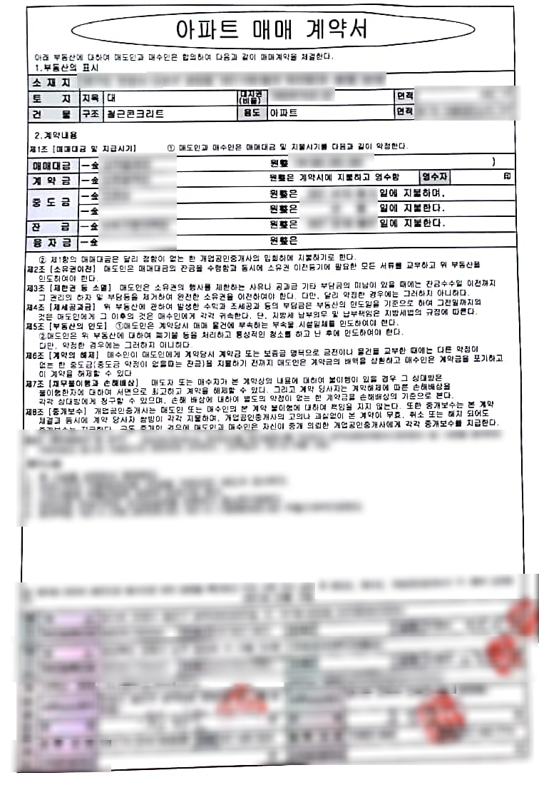 아파트 매매 계약을 진행하면 아파트 매매 계약서를 받을 수 있다. 여기에는 언제 계약을 했고, 중도금과 잔금은 언제 지불해야 하는지 명시되어 있다. 일반적인 경우에 잔금일에 대출을 실행해야 한다는 점을 기억하자. 필자의 경우 아래와 같이 아파트 매매 계약을 진행하고, 스캔하였다.