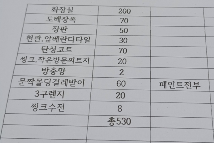 각종 세금이나 중개비의 경우 몇백만 원 정도 수준이다. 수리나 인테리어의 경우 많으면 3,000 ~ 4,000만 원 정도 깨지는 경우도 많다. 필자의 경우 집 상태가 나쁘지 않았기 때문에, 다음과 같이 총 530만 원 정도의 견적으로 저렴하게 수리 견적을 받았다.