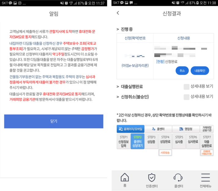 신청 결과 페이지에서는 현재 어떤 STEP에 왔는지 그림을 통해 보여준다. 방금 신청을 했기 때문에 [콜센터 상담대기] 스텝에 머물러 있는 것을 알 수 있다. 이제 조금 기다리면 콜센터로부터 연락이 오게 된다.