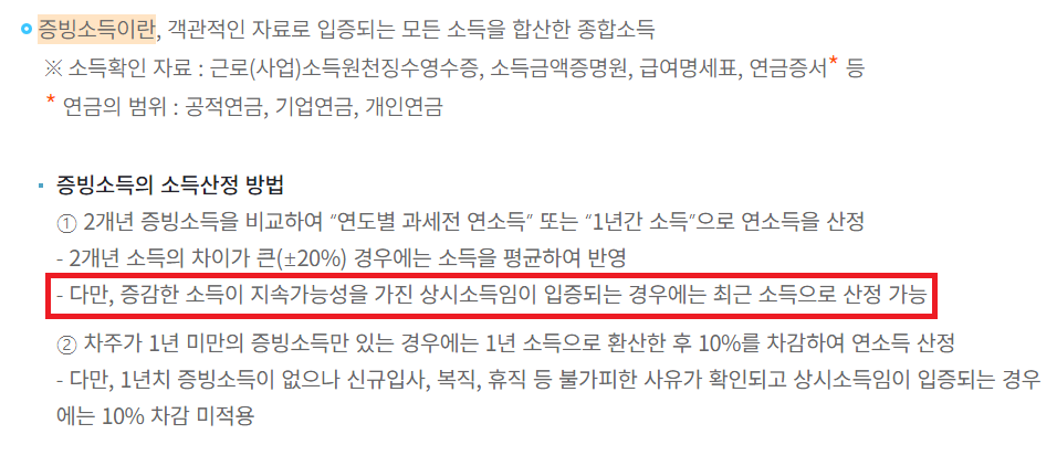 또한 증빙 소득 관련 문제가 생겼다. 일반적으로 증빙 소득은 2개년을 비교한다. 사이트에 방문해 보니 다음과 같이 자세한 내용이 나와 있다.