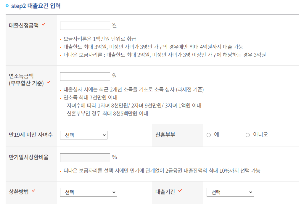 특히 여기에서 꼭 해봐야 하는 것은 [보금자리론 예상대출조회]이다. 아래와 같이 대출요건을 입력하여 어느 정도 금액의 대출이 가능할지 계산할 수 있다.