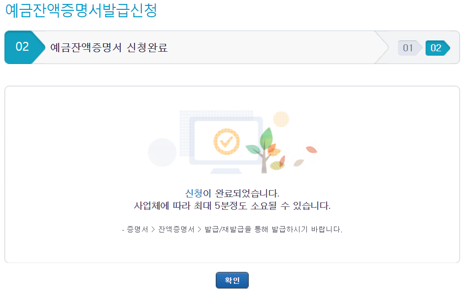 통장을 조회한 뒤에 발급 신청을 진행하면, 다음과 같이 5분 정도 소요될 수 있다고 한다. 필자의 경우 몇십 초 정도 기다렸다가 [확인] 버튼을 누르니까 정상적으로 발급이 완료된 것을 확인할 수 있었다.
