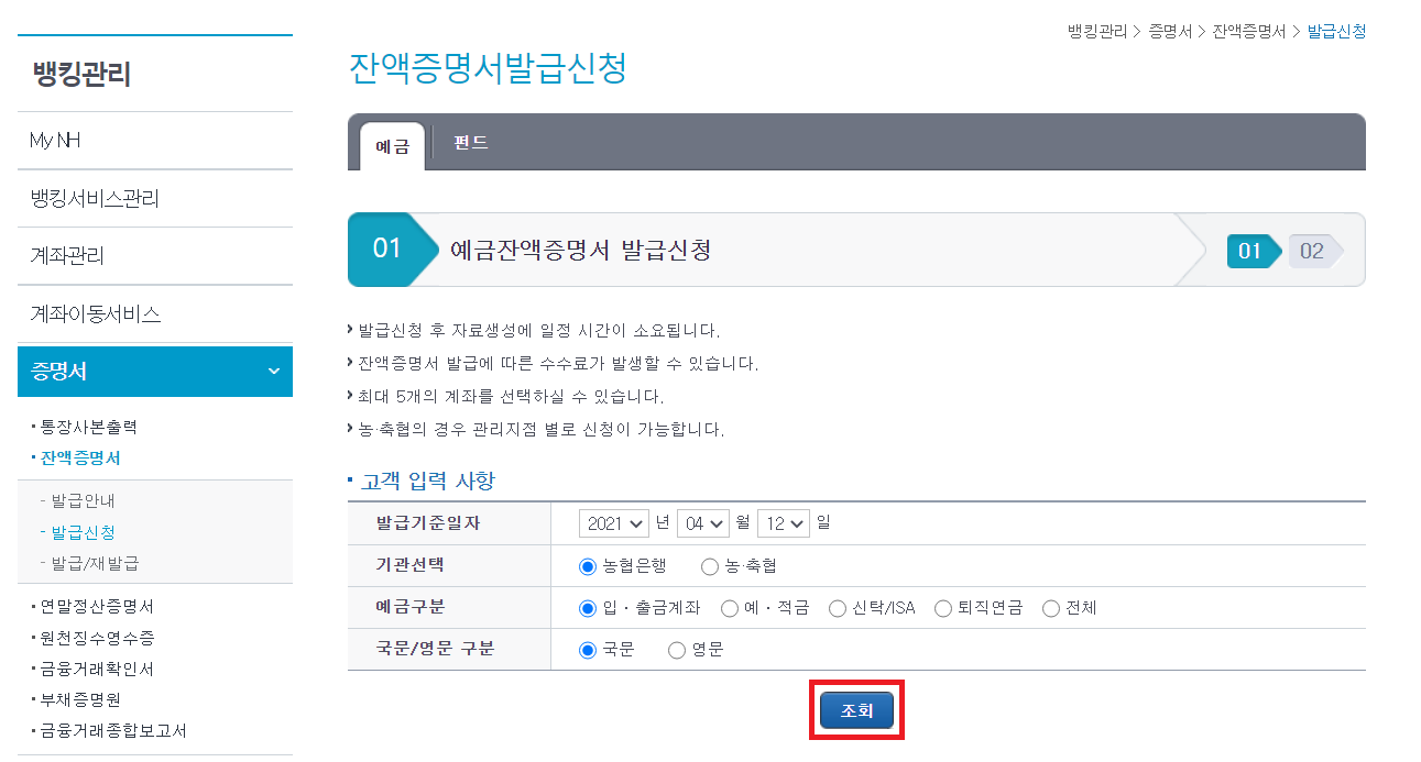 농협 [개인]으로 접속한 뒤에 공인인증서(공동인증서)를 이용하여 로그인을 진행한다. 이후에 [잔액증명서] 페이지로 이동하여 예금잔액증명서를 발급받을 수 있다.