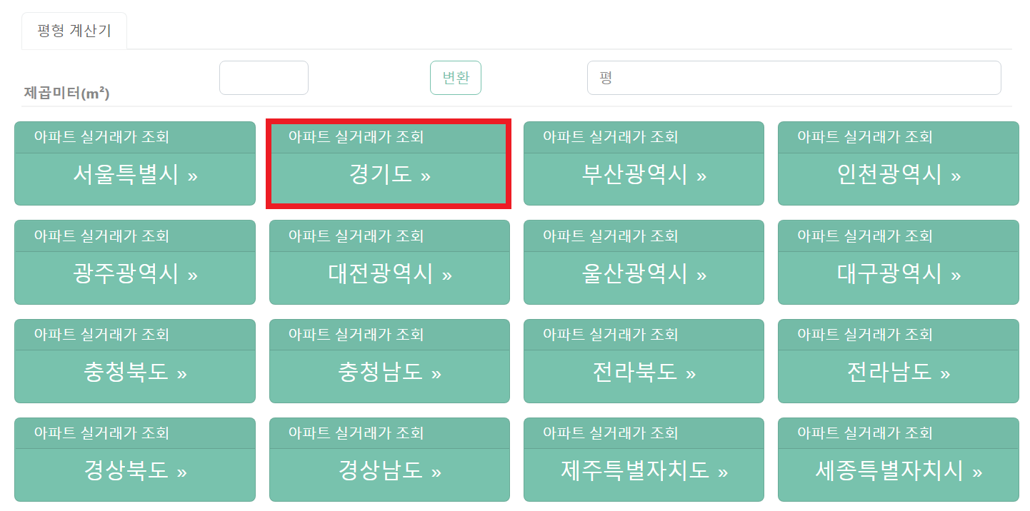 접속 이후에 자신이 원하는 지역에 대한 부동산 실거래가를 조회할 수 있다. 예를 들어 [경기도] 탭으로 이동해보자.