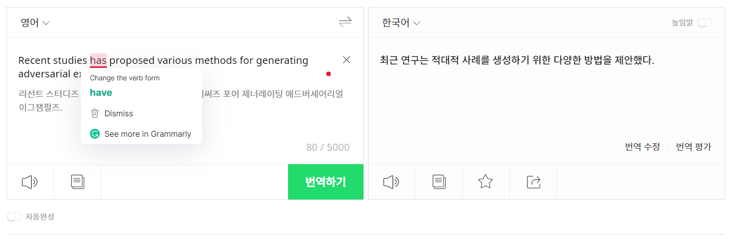나는 논문 쓸 때 파파고에 영어 작문하면서, 동시에 한국어로 어떻게 번역되는지 확인한다. 그와 동시에 grammarly 유료 버전으로 이중 체크를 하는 편이다. 나만 이러는 줄 알았는데, 주변 친구들이랑 이야기해보니 나 말고도 이렇게 영작을 하는 분들이 꽤 있었다 ㅋㅋㅋㅋㅋ 석사 생활하면서 내가 오랜 시간 사용했던 영작 꿀팁이다.