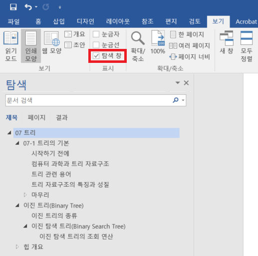 가끔 워드(Word)로 작업하다가 목차가 안 보일 때가 있다. 이럴 때는 [보기] - [탐색 창] 버튼을 누르면 목차가 보인다.
