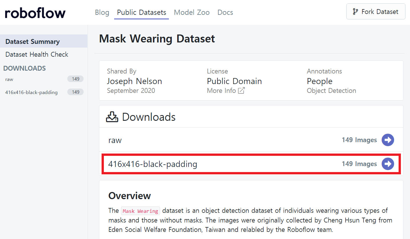 그러면 한 번 [Mask Wearing Dataset]을 다운로드하겠습니다. 저는 다음과 같이 416 X 416 해상도의 데이터 세트를 다운로드하겠습니다. 416 X 416 해상도 데이터 세트의 경우, 원본 이미지의 해상도가 다르다고 하더라도 패딩(padding)을 채워 넣어 416 X 416 해상도를 맞춘 것을 의미합니다.