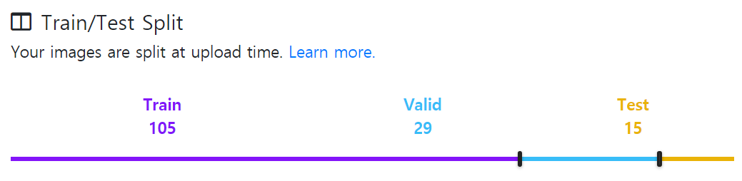 참고로 마스크 데이터셋의 경우 다음과 같은 (학습:평가:테스트) 데이터 세트 비율을 가지고 있습니다. 사실 컴퓨터 비전 쪽 분야인데 너무 데이터 세트의 크기가 작아 보일 수 있습니다. 하지만 일반적으로 객체 탐지(Object Detection) 분야에서는 전이 학습(Transfer Learning)을 베이스로 깔고 가는 경우가 많기 때문에, 데이터 개수가 100개만 넘어도 최소한의 성능은 나오는 경우가 많습니다.