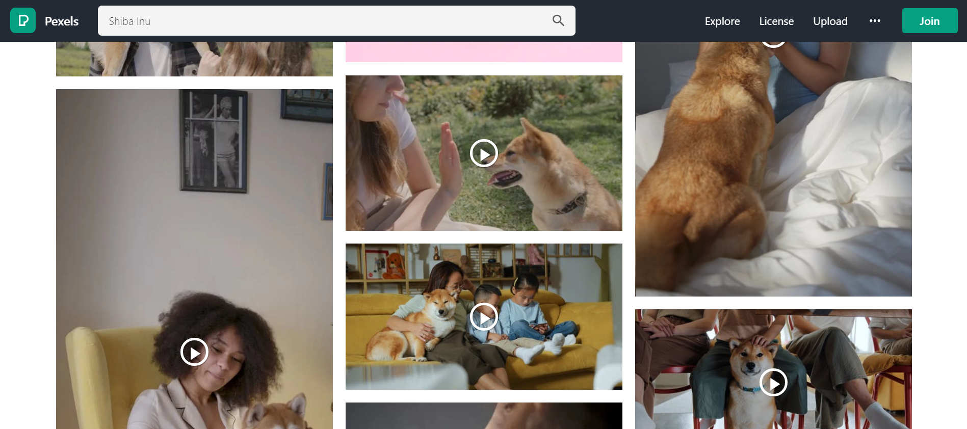 사이트 접속 이후에 다음과 같이 원하는 키워드로 검색할 수 있습니다. 예를 들어 "Shiba Inu"라고 검색하면 다음과 같이 다양한 동영상이 등장합니다.