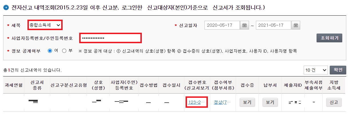 이후에 세목으로 [종합소득세]를 선택하고, 사업자등록번호/주민등록번호를 입력하여 [조회하기] 버튼을 누르면 된다. 그리고 신고서가 나오면 이를 클릭하여 확인할 수 있다.