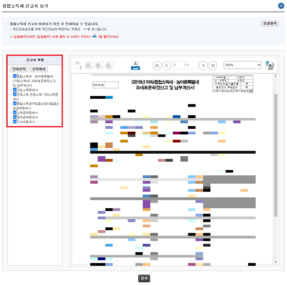 이어서 [종합소득세 신고서 보기] 창이 뜨고, 자세한 종합소득세 정보를 확인할 수 있습니다.