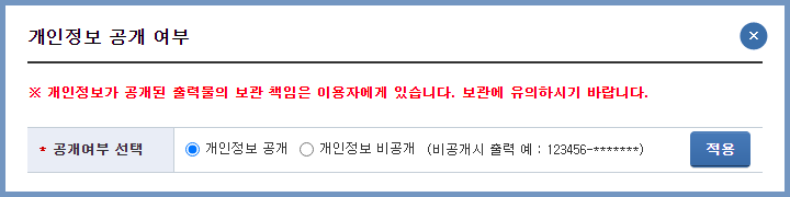 이때 신고서 문서상으로 주민등록번호와 같은 개인정보가 출력되도록 할 것인지 결정할 수 있도록, [개인정보 공개 여부] 창이 등장할 수 있습니다. 자신이 원하는 설정에 따라서 [적용]하면 됩니다.