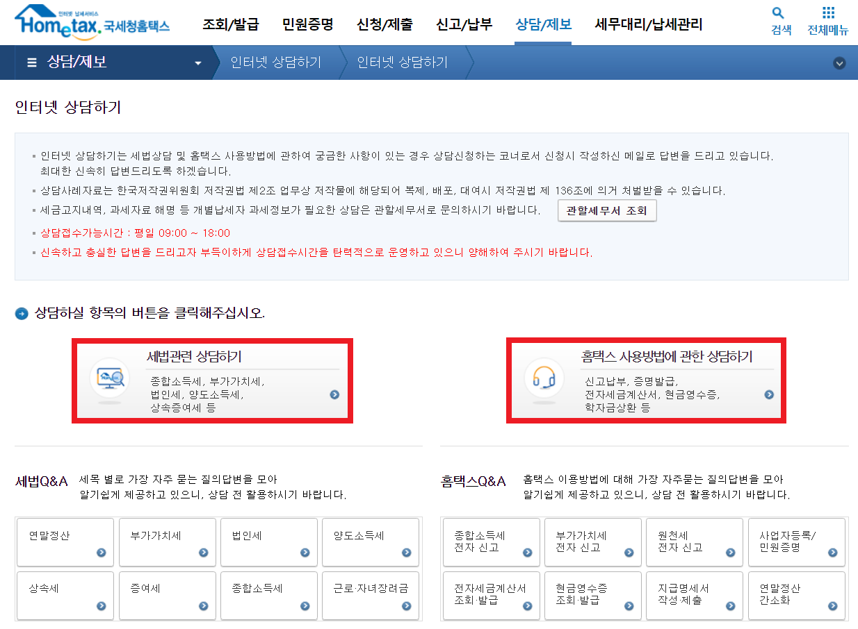 국세청 홈택스에 방문하면 무료로 인터넷 상담을 진행할 수 있다.