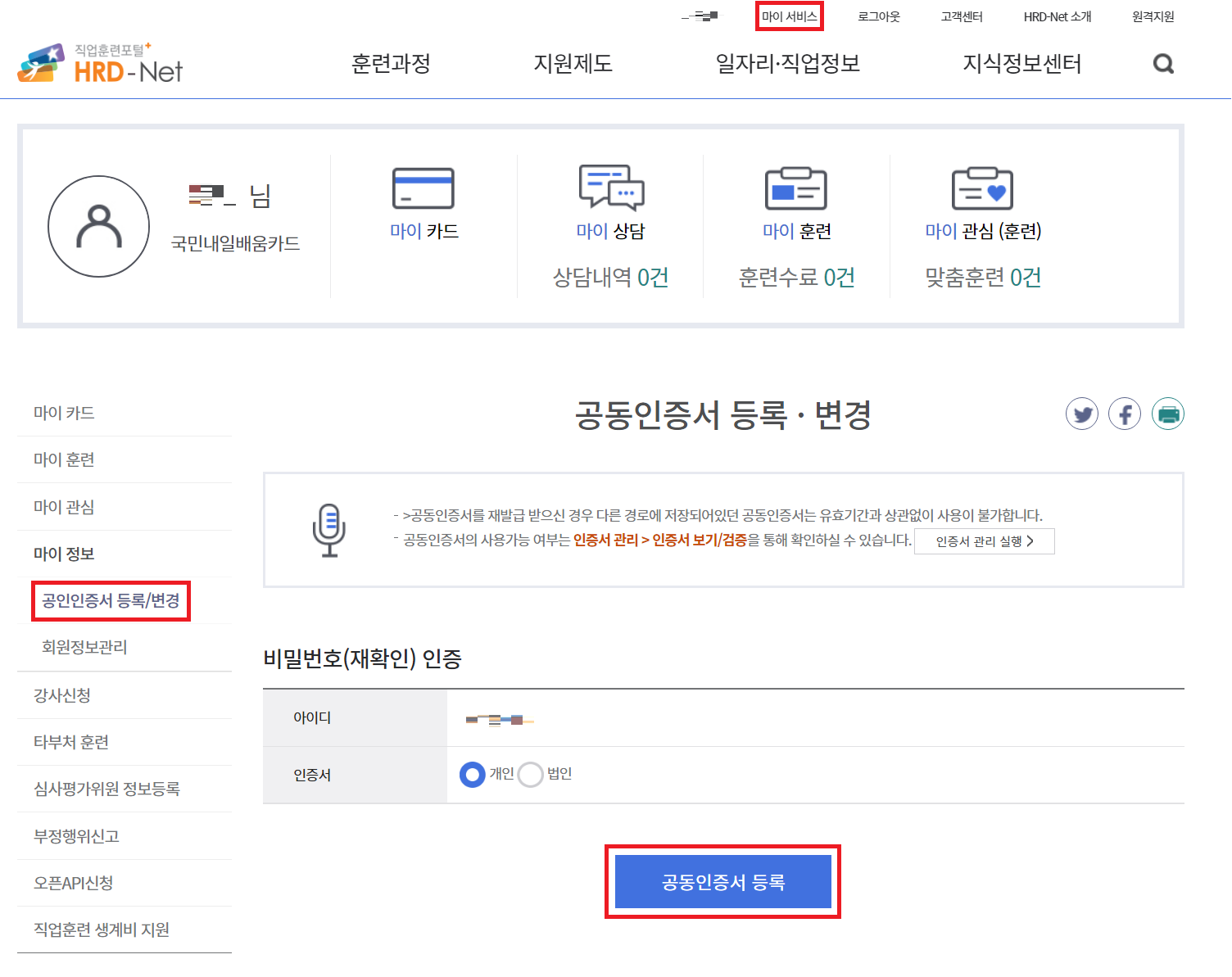 이후에 [마이 서비스] - [공인인증서 등록/변경]에 들어가서 공동인증서(공인인증서)를 등록합니다.