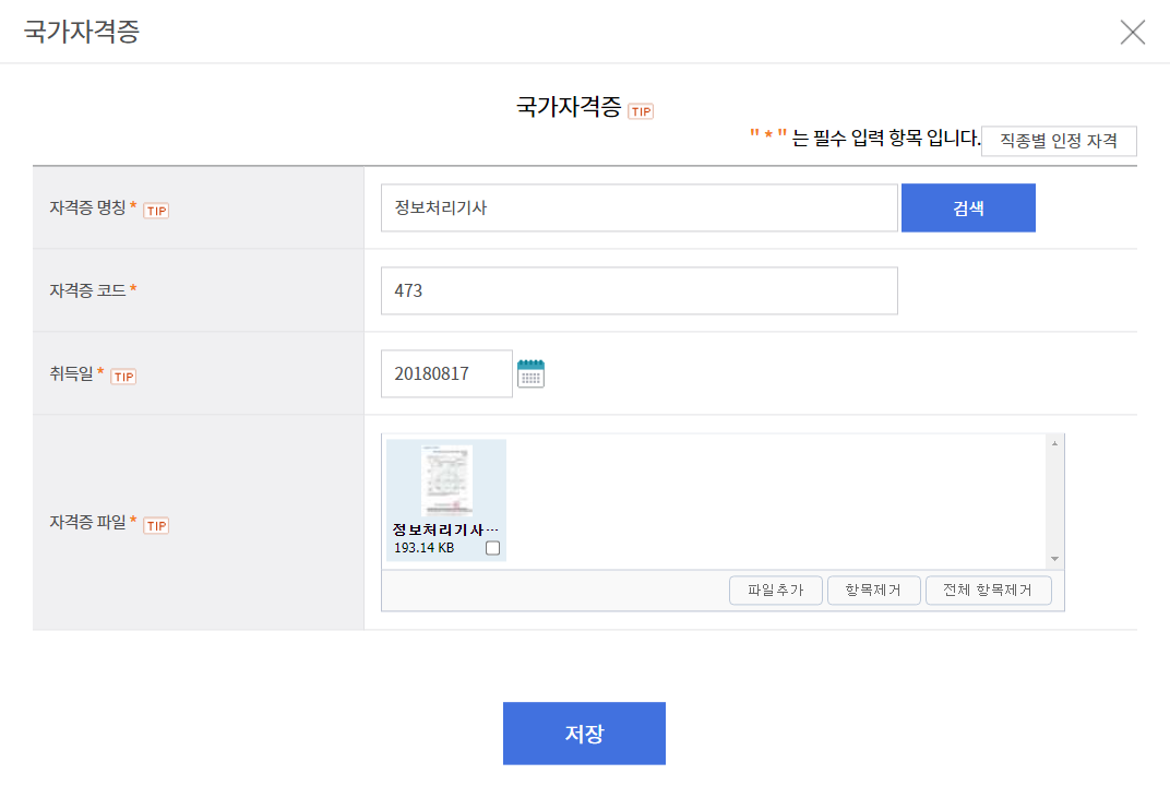 이어서 [국가자격증] 란에서는 다음과 같이 정보처리기사 자격증의 [국가기술자격 취득사항 확인서]를 제출했습니다. 단순히 사진 파일(.jpg)로 간단히 업로드 했습니다. 참고로 첨부파일 내 개인정보(주민번호, 여권번호 등)가 포함된 경우, 개인정보를 마스킹해서 업로드하라고 명시되어 있습니다.