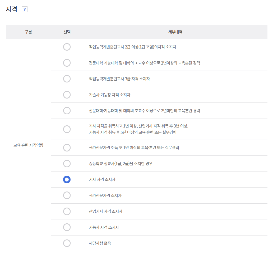 이후에 자격 요건을 넣습니다. 필자의 경우 [기사 자격 소지자]를 선택했습니다.