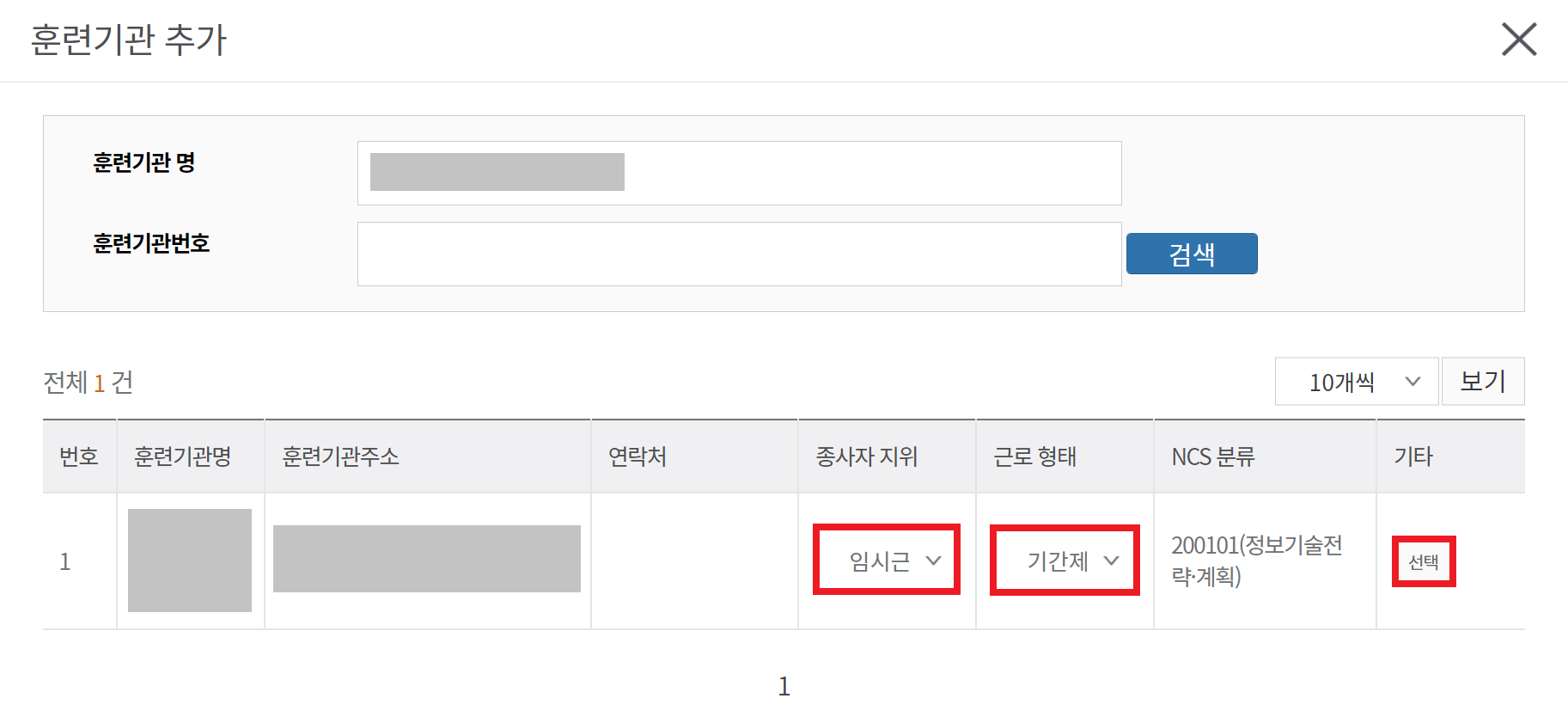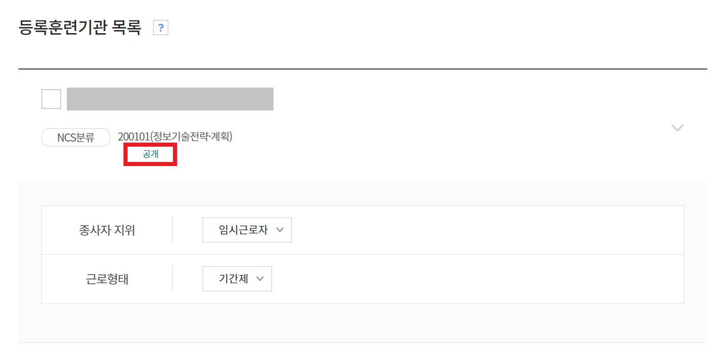 이후에 훈련기관명을 검색하여 해당하는 기관을 찾습니다. 저는 가끔씩 해당 기관으로 강의를 나가기 위한 목적으로 강사 등록을 진행하는 것이므로, [임시근로자]를 선택했고, [기간제]를 선택했습니다. 이후에 [선택] 버튼을 누르면 훈련기관 등록이 완료됩니다.