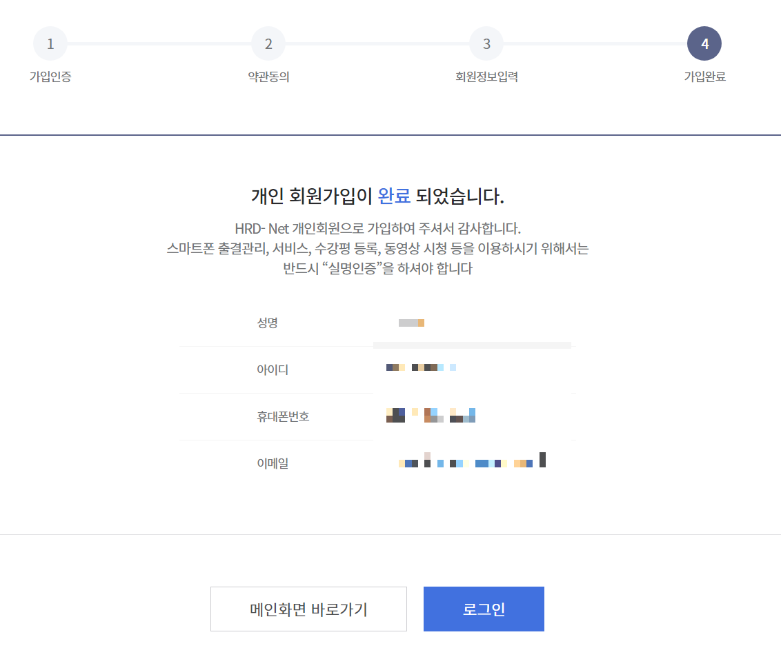 이후에 휴대폰 인증을 진행하고, 약관에 동의한 뒤에, 회원 정보를 입력하고 회원가입을 진행하면 됩니다. 회원가입이 완료되면 다음과 같이 [가입완료] 메시지가 출력됩니다.