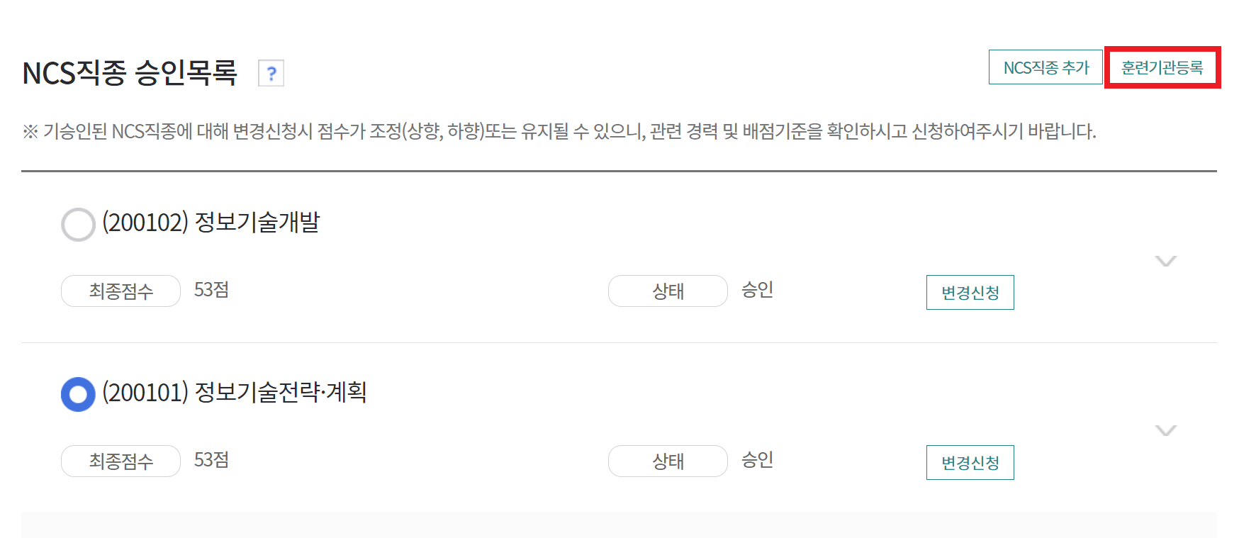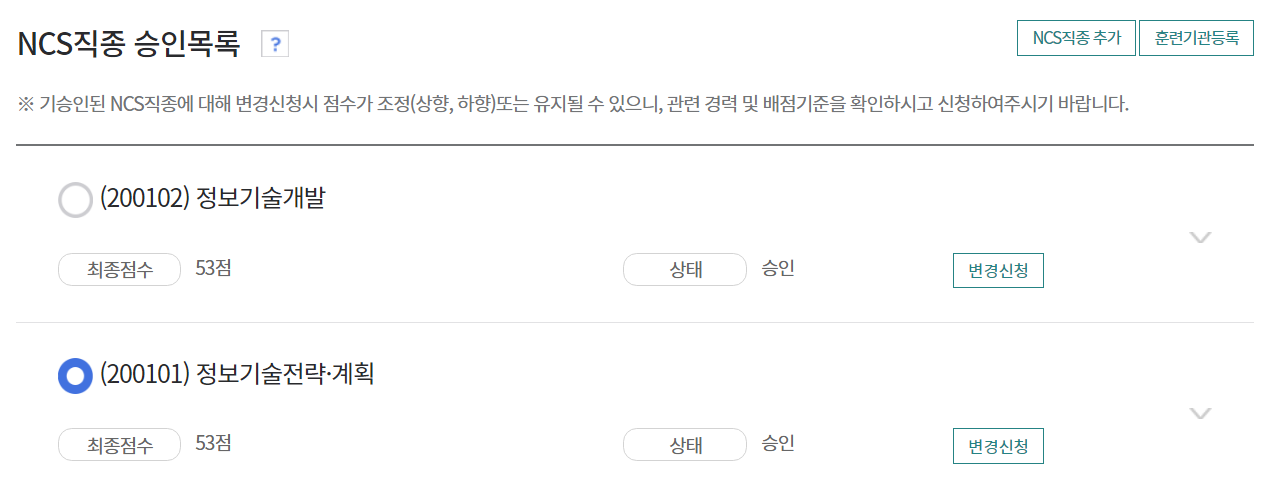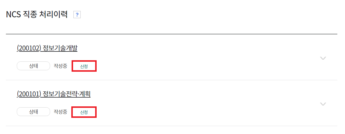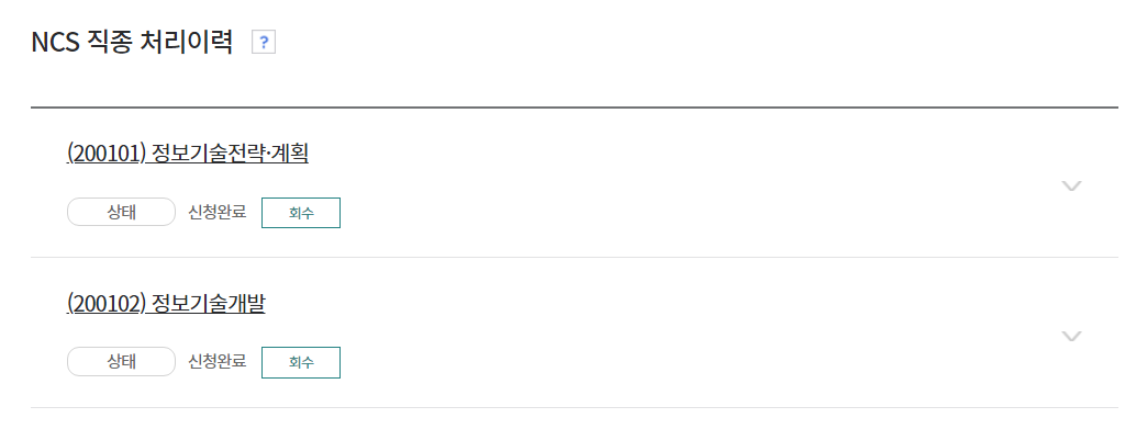 필자의 경우 다음과 같이 두 개의 NCS 직종에 대하여 각각 [신청완료] 처리되었습니다.