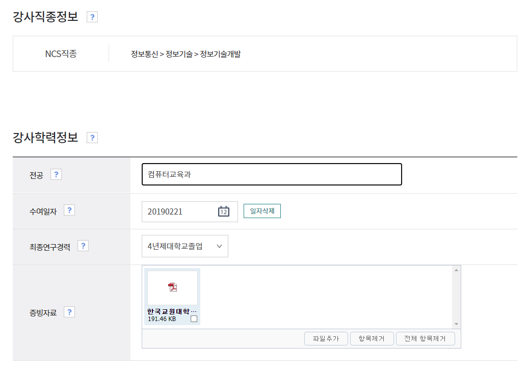 이어서 가장 먼저 강사직종정보를 확인했습니다. 정보기술개발로 잘 들어가 있네요. 그리고 학력정보를 넣었습니다. 필자의 경우에는 한국교원대학교 컴퓨터교육과 학부 졸업증명서를 제출했습니다.