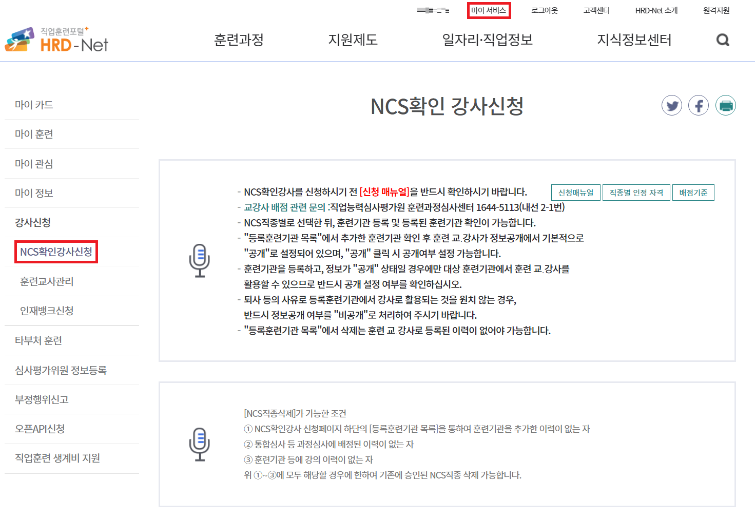 이제 NCS 확인강사 신청을 진행합니다. [마이 서비스] - [강사신청] - [NCS확인강사신청]에 들어갑니다. 참고로 여기에서는 [신청매뉴얼], [직종별 인정 자격], [배점기준] 등을 확인할 수 있습니다.